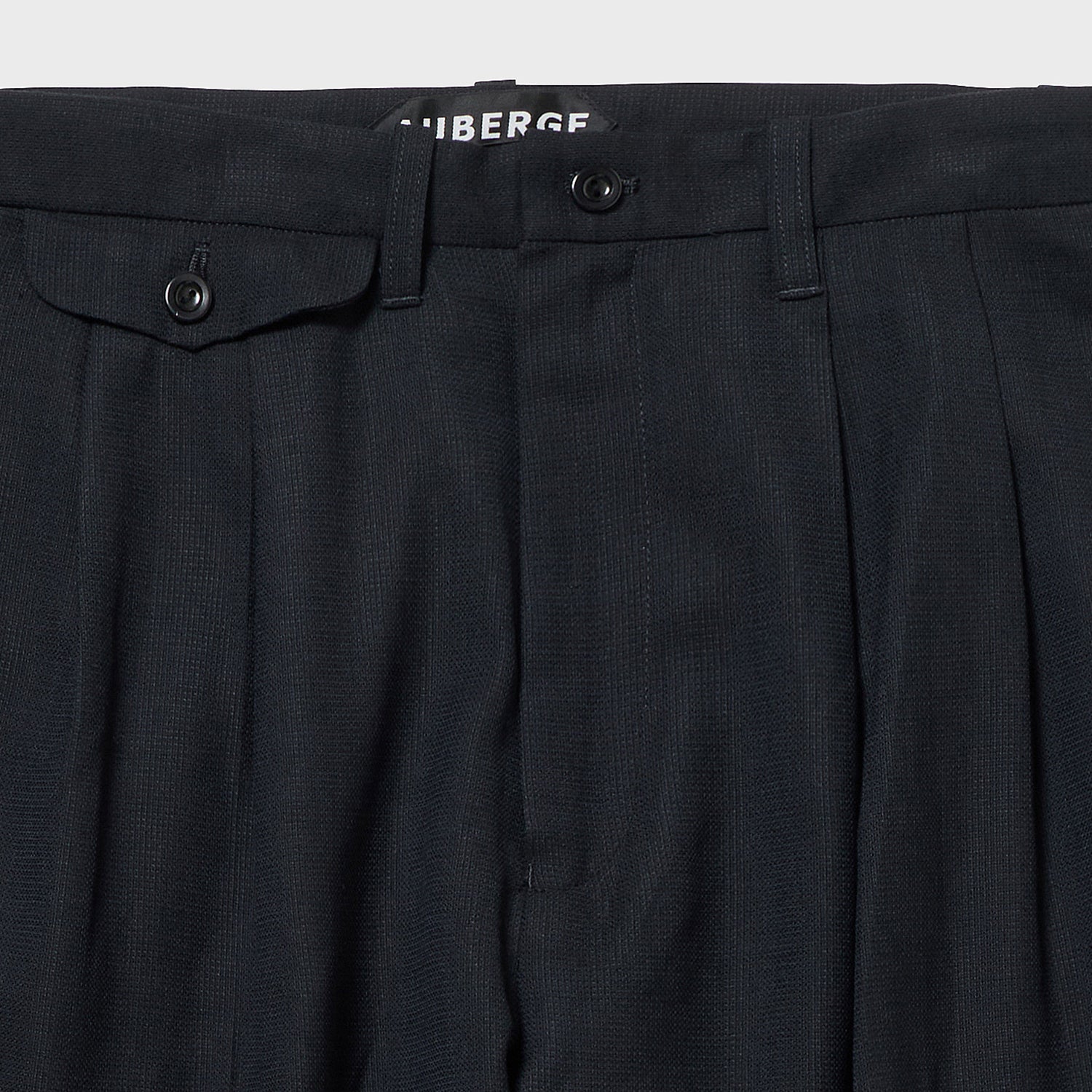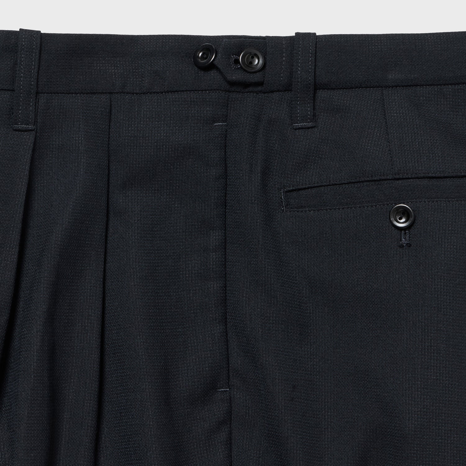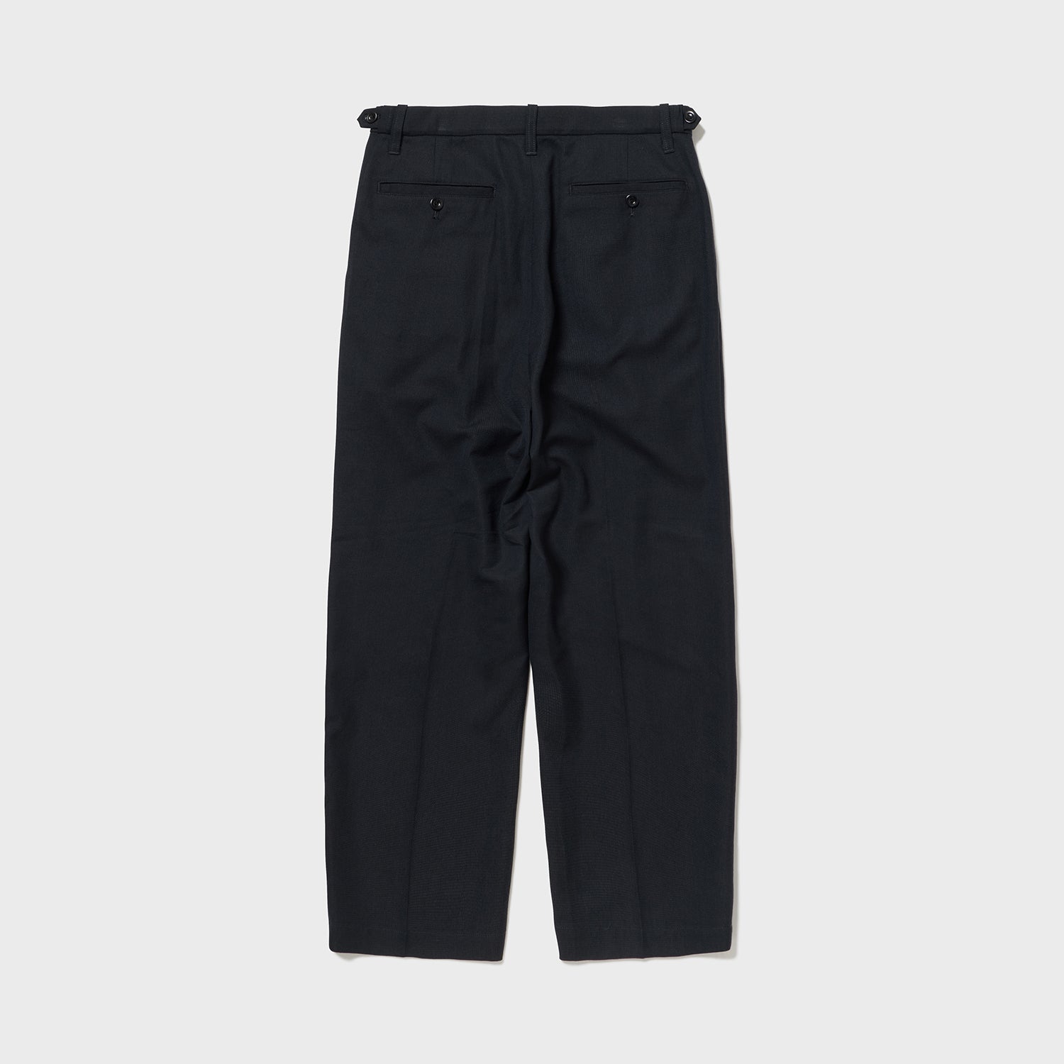 イギリスCC41時代のスラックスから後ろベルトにサイズアジャストのゴムが入る極めて珍しいスラックスを入手、採用した。これにより1サイズ上下にサイズを変えることが出来、戦時中の物の少ない時代のアイデアと思います。当時の流行だったのか、ほぼ何も入らないのに付いているビッグフラップなコインポケットも、もちろん装備。
