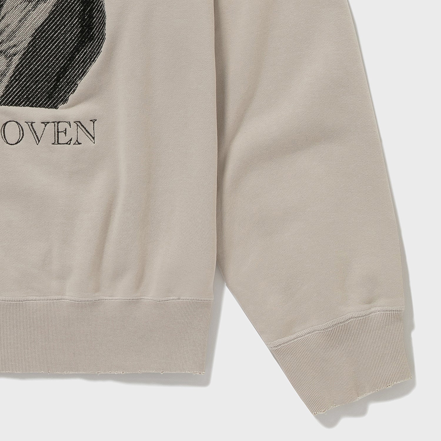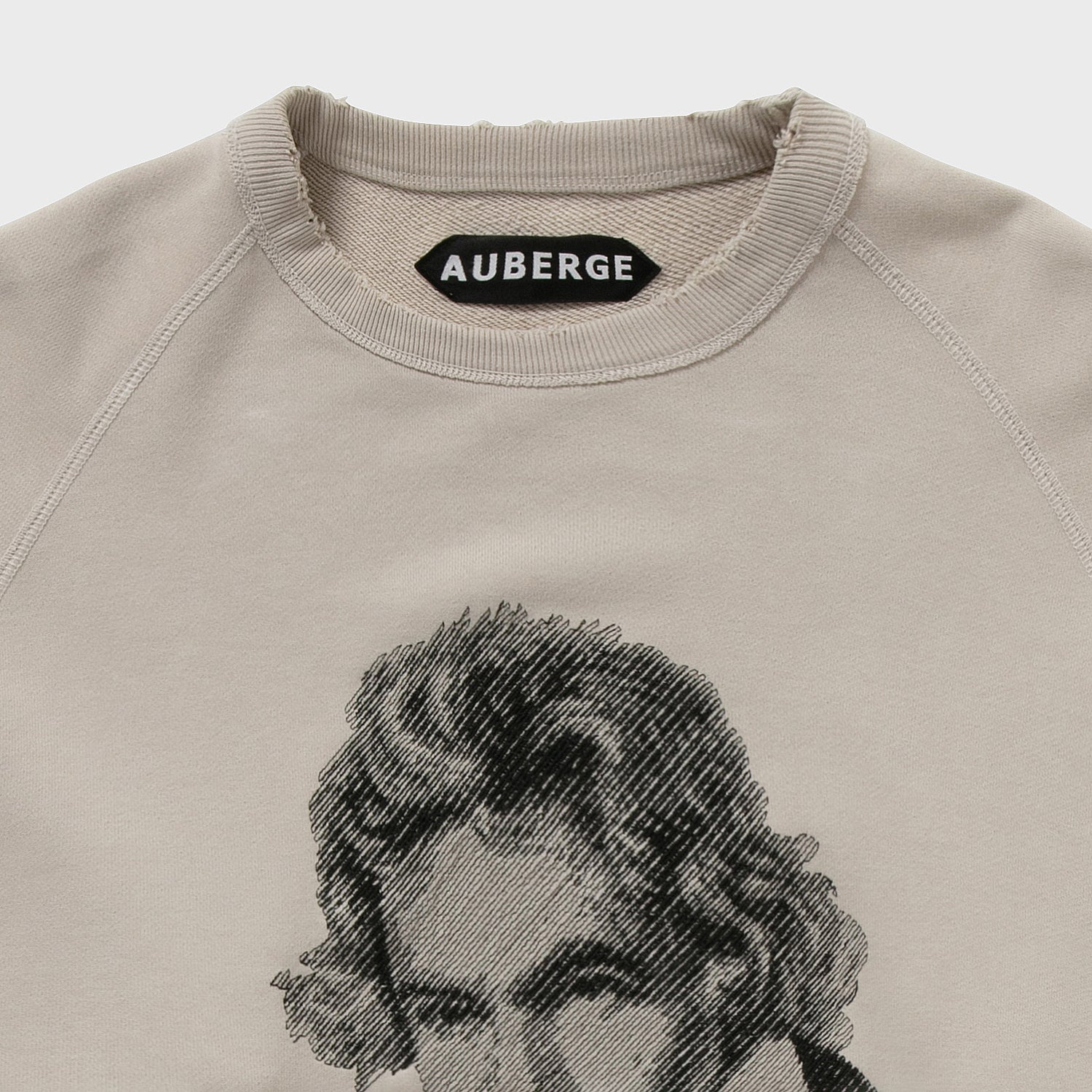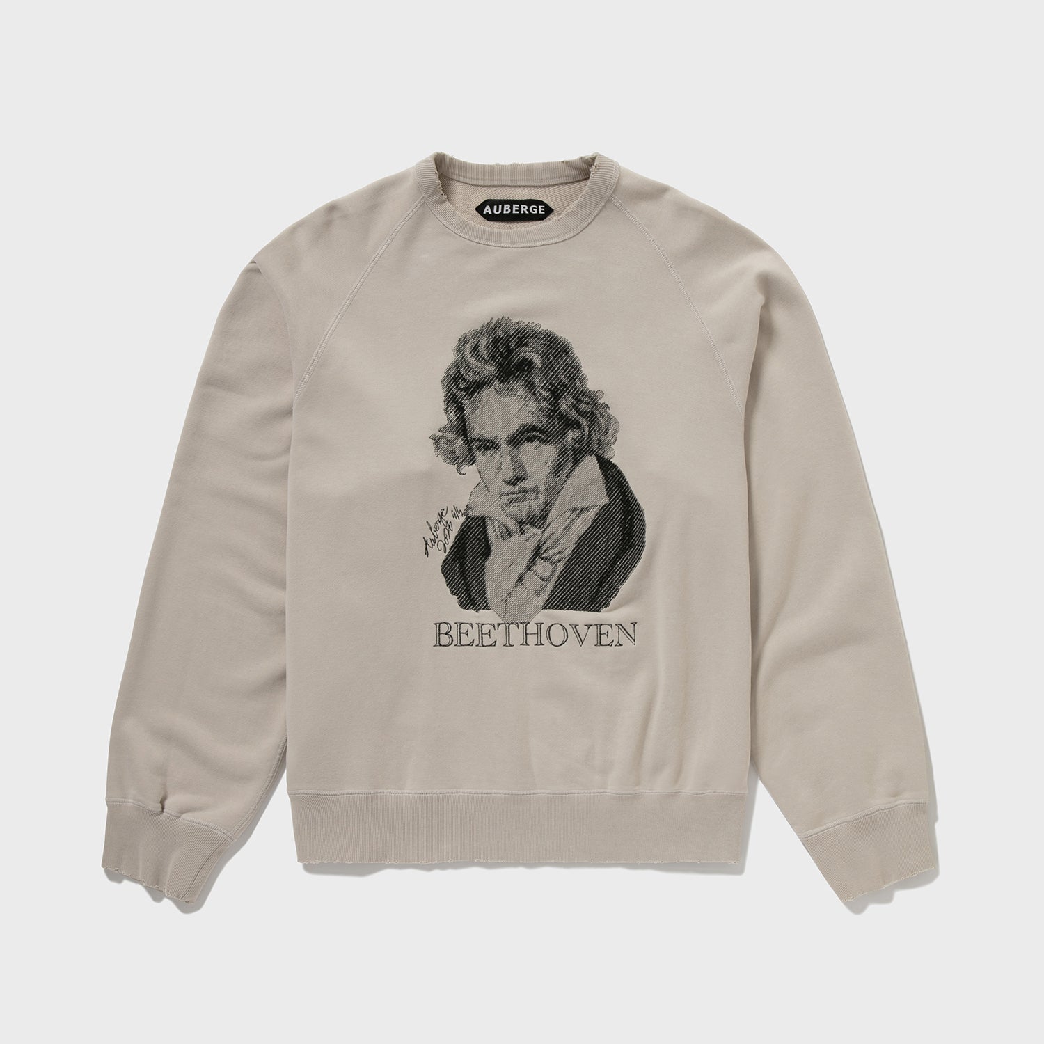 【デザイン】胸元のベートーベンはなんと刺繍で表現されている。これはAUBERGEがしばしば採用する写真画像を地震計の針のような動きで再現する桐生の刺繍工場の技術である。ちょっとレトロでアート感あふれる仕上がりが毎回気に入っている。ちゃんとこの画像に関してプロダクトライセンス料を支払っての使用である(笑)。あえてベートーベンにしたのは、数多のブランドがこのモチーフに挑み、たいてい刷るだけの中で、このモチーフをジャズスタンダードの名曲に見立てAUBERGEならこう演奏する、そんな気分のアプローチなのである。なので有名スタンダードネタである必要があった。