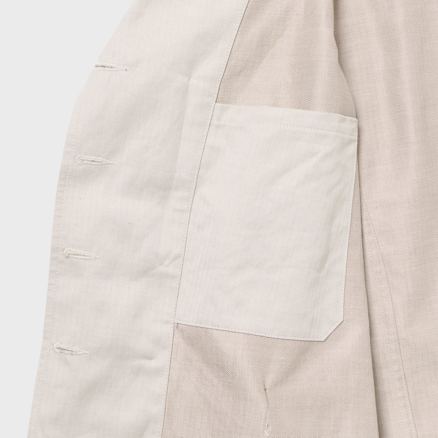 また、ラペル下側がボタンで留まるのも、象徴的なディテールです。