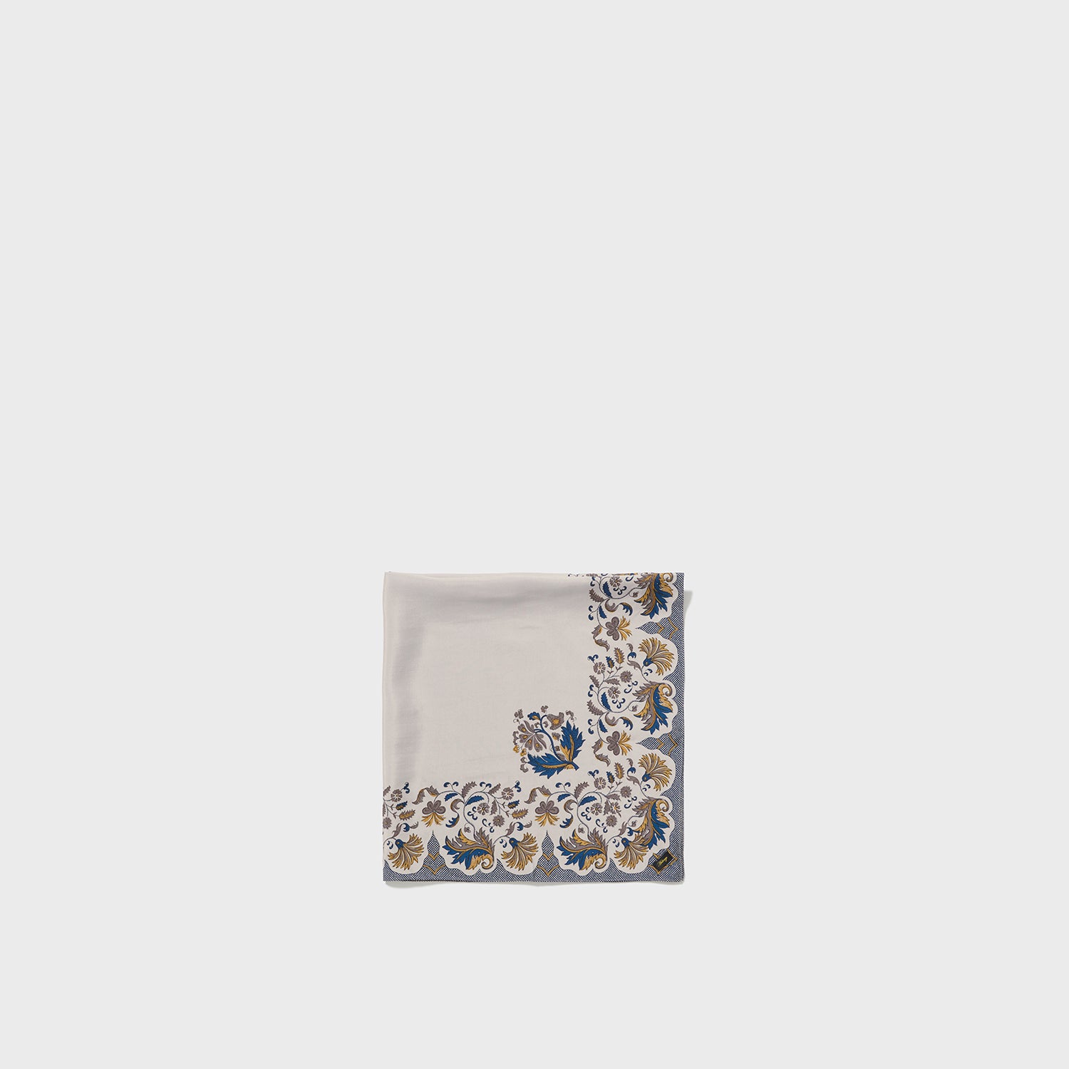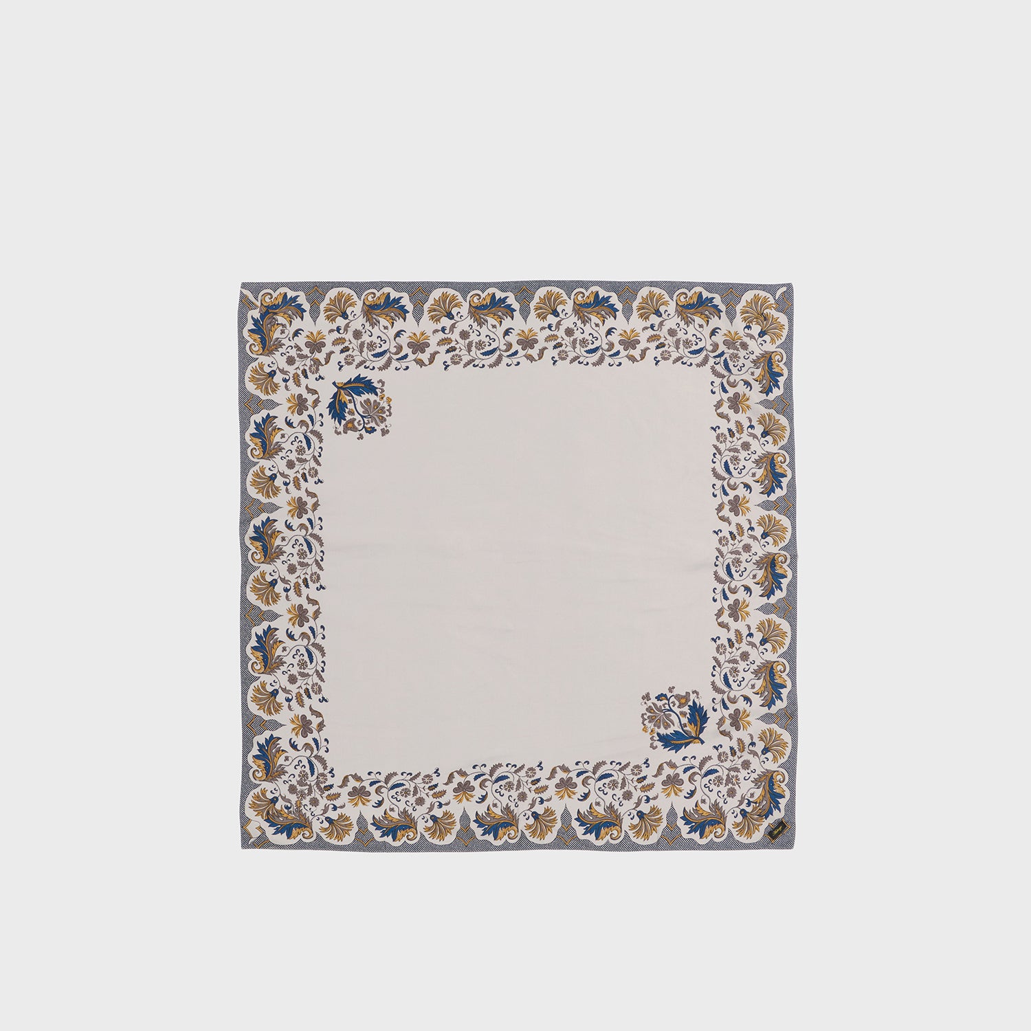柄はKEVINと共通、北フランスで200年前に作られたFICHUフィシュと呼ばれるスカーフを京都の超絶プリント工場で再現いたしました。モチーフはアザミの花と葉で当時のスタンダード。東インド会社が17世紀インドからヨーロッパへもたらしたペーズリー、小花のようなエキゾチック柄はその後時代を経てアメリカのバンダナへと繋がっていく。その源流のようなフレンチテキスタイルの再現である。