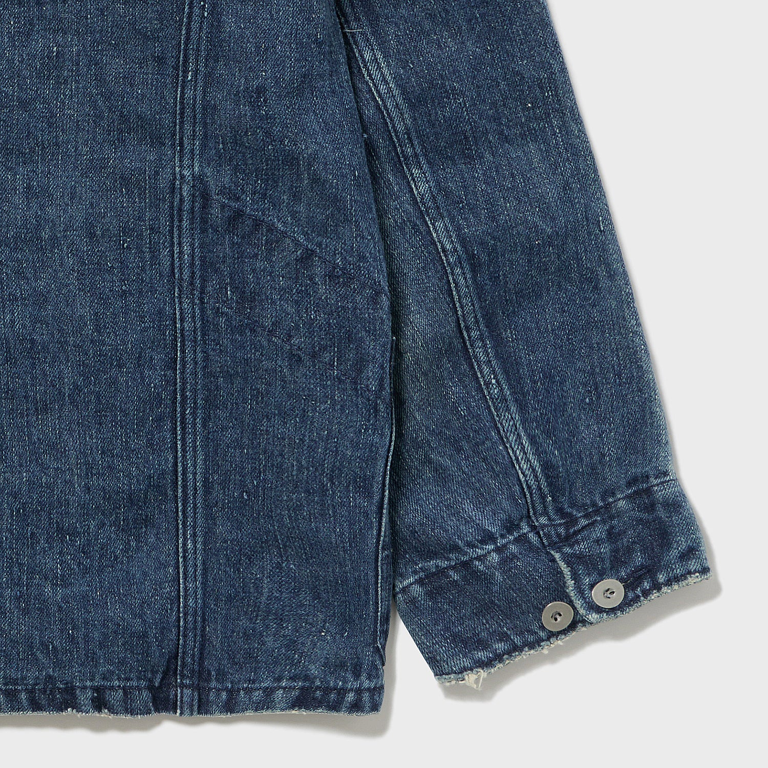 麻原料+インディゴの生地はアメリカにはあまり流通しておらず、フランス、ヨーロッパが19世紀まではメインであったことから、UKワークウエア界の異端児「Fabram」社のスタンドカラーセットアップをイメージ致しました。イギリス独特のワークでありながら前に振る袖もしっかり型紙に反映しております。